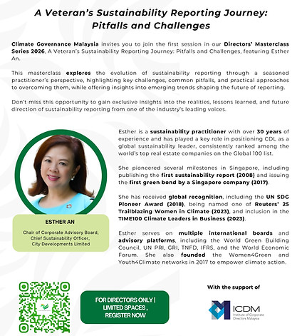 Elevate your boardroom leadership with Climate Governance Malaysia's flagship Directors’ Masterclass Series—now in its fourth year of empowering top executives. This exclusive capacity-building program delivers actionable insights on climate, nature, and sustainability risks and opportunities, transforming global complexities into board-ready strategies for smarter governance and resilient growth.