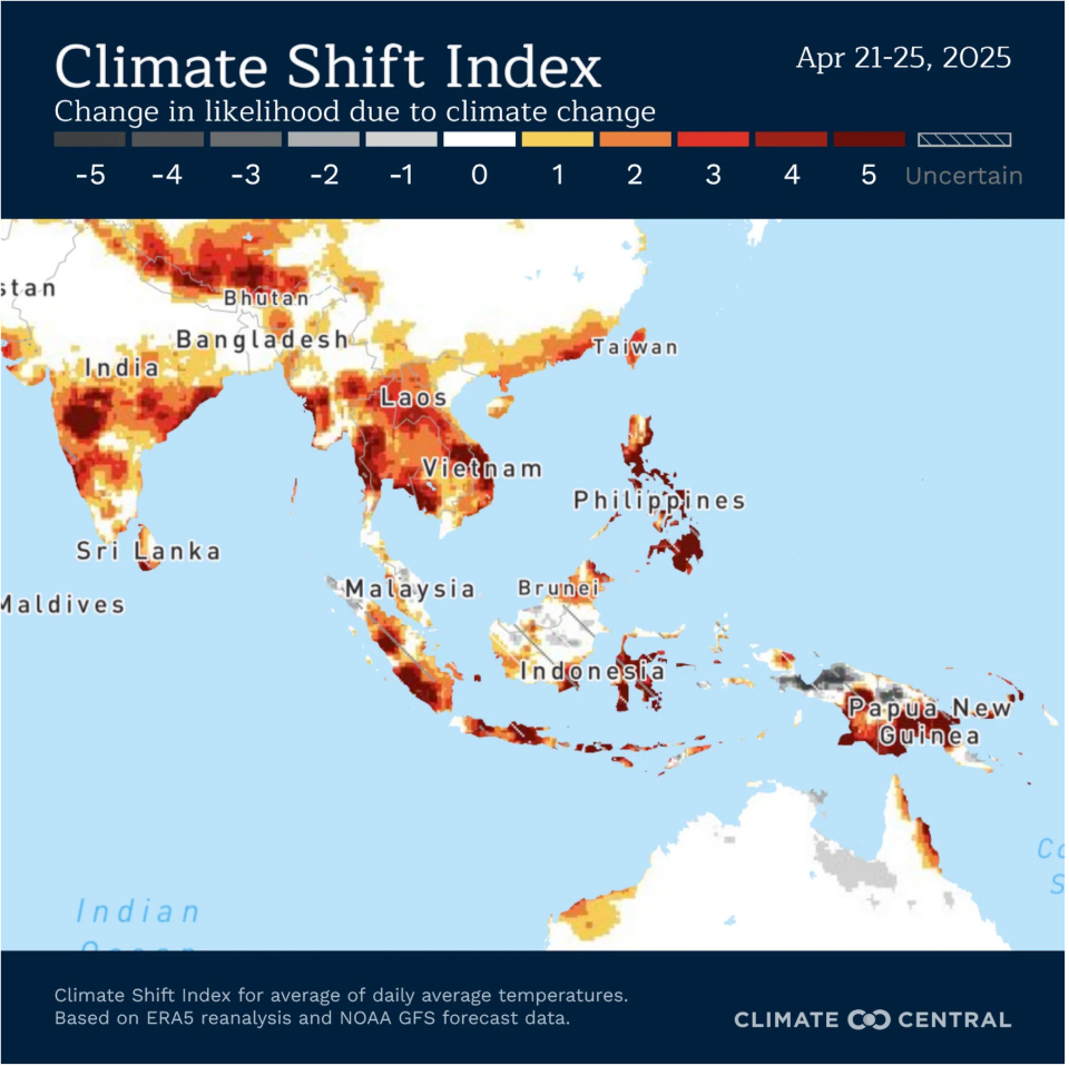 I raise this point because I believe that the warming we see happening in the US is also happening here in Asia. This is particularly so in Southeast Asia, where we keep a close watch on the status of the El Niño Southern Oscillation (ENSO), in the general belief that localized and regional rainfall and temperature conditions are strongly shaped by these cyclical phenomena. What has become evident in recent months is that high temperature anomalies (shown to the left) all occurred during ENSO-neutral and even marginal La Niña ENSO phases . Although el Niño conditions ended around April of 2024, the 2025 rash of heatwaves began in Indonesia at the end of 2024, followed throughout 2025 by heatwaves in the Philippines, Myanmar, Thailand, Vietnam, India and Pakistan, all during an ENSO-neutral phase.