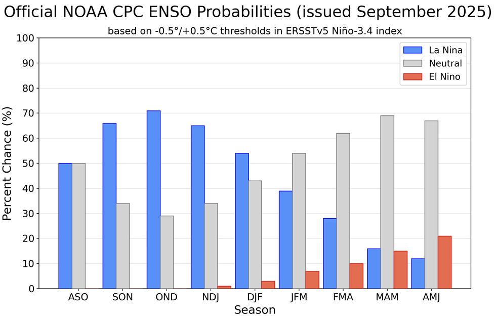 As September gives way to October, we see from the NOAA, CPC ENSO Probabilities (right) that the remainder of 2025 is anticipated to favour La Niña conditions (blue bars), giving way to the probability for ENSO-neutral conditions (grey bars) for the first half of 2026, with an initially, unlikely, but growing probability for El Niño conditions (red bars) as 2026 progresses. If high temperatures and even heatwaves become the hallmark of ENSO-neutral conditions, we will need to be doubly prepared for the heatwave conditions that would coincide with the reduced rainfall and dry conditions associated with El Nino conditions and the severe drought that could follow.
